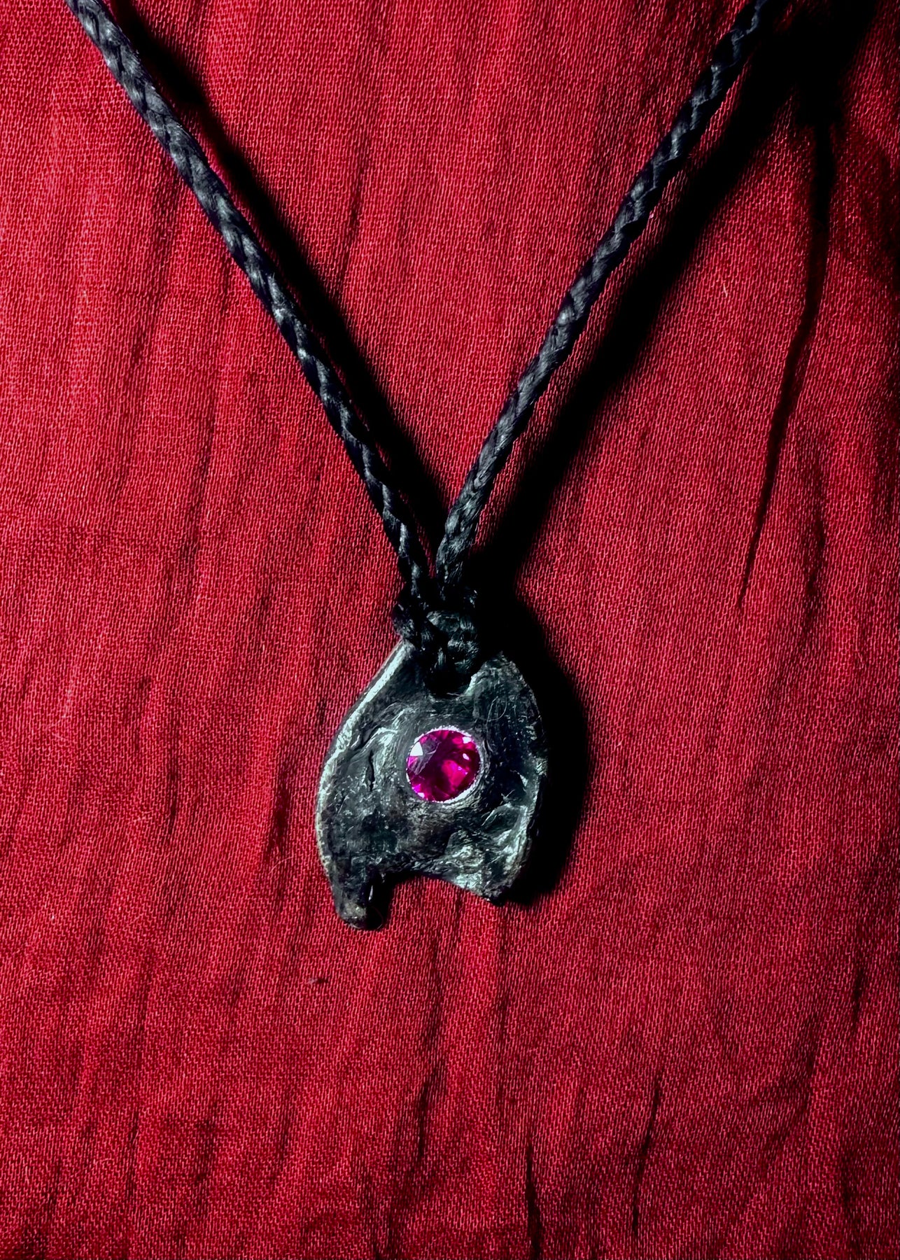 The Exalted Mars Cazimi Talismans are cast in .999 silver, formed in the shape of a textured iron-hewn shield, and bearing a 6mm Ruby that was ritually worked and empowered during Haus’ January 6th, 2026 Exalted Mars Cazimi election. During their creation, each talisman had Exalted Mars Cazimi Powder burned on its surface while it was molten and the same was placed behind its Ruby. Each talisman has been washed with a dark grey patina and coated in a protective wax.